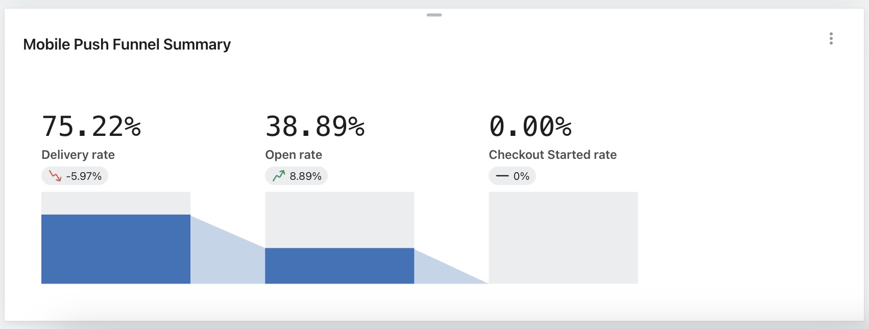모바일 푸시 퍼널 요약 카드는 모바일 푸시 메시지 전반의 핵심 성과 지표(KPI)를 집계하여 구독자가 퍼널에서 이탈하는 위치를 확인할 수 있도록 합니다. 막대 그래프를 통해 배달, 열기, 전환에 대한 전체 비율을 확인하고 중요한 이탈이 발생할 수 있는 부분을 확인할 수 있습니다.