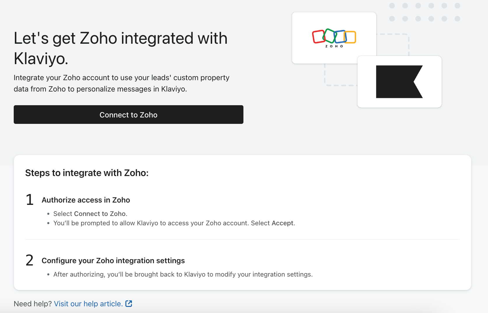 Heb je problemen met je Zoho integraties? Het kan zijn dat je onze oude integraties gebruikt die zijn afgeschreven. Klaviyo heeft een nieuwe Zoho integratie uitgebracht om de beveiliging en stabiliteit te verbeteren.