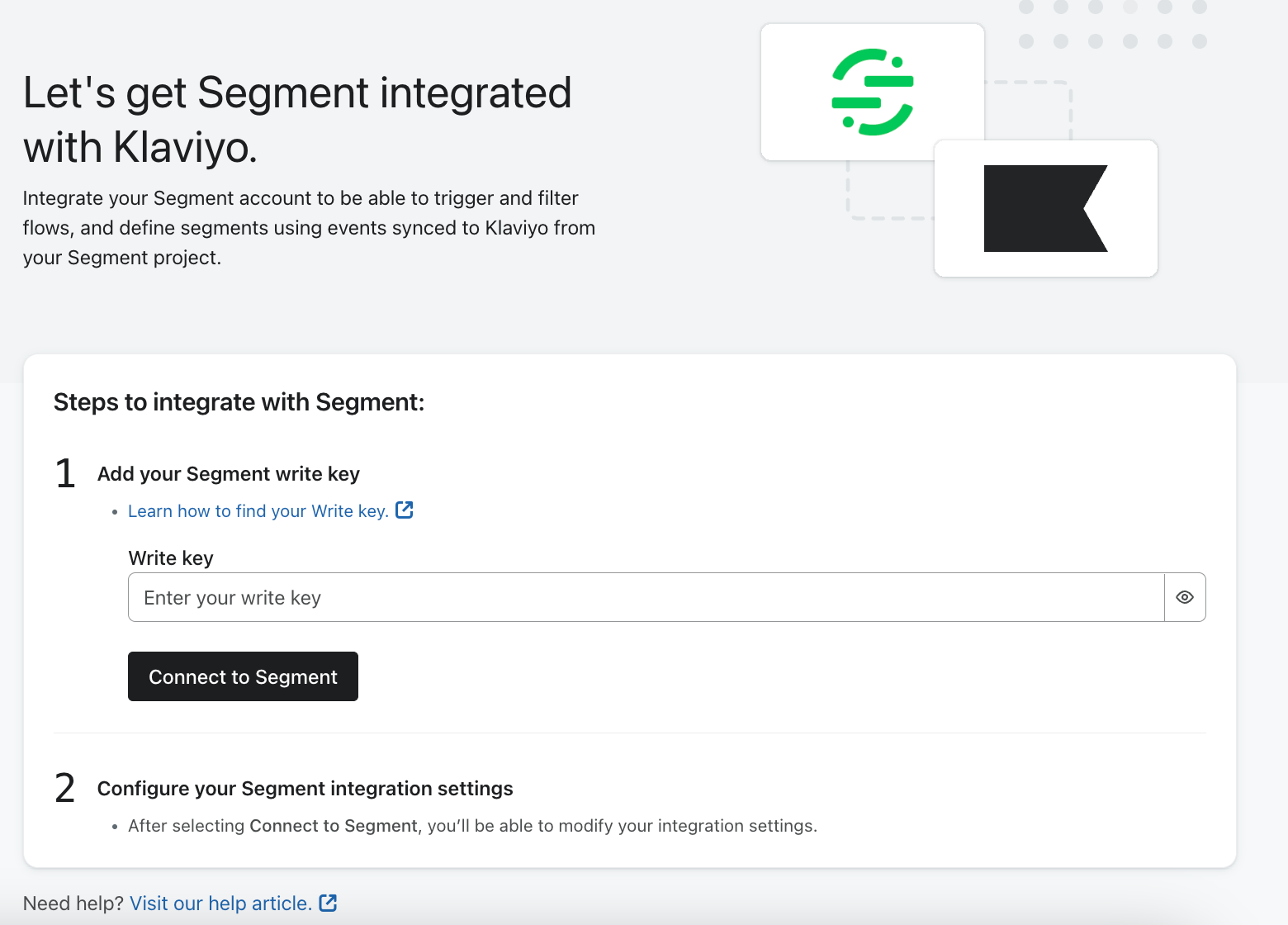 Deze integratie verloopt in twee stappen: de integratie aan de segmentkant inschakelen en de integratie aan de Klaviyo kant inschakelen. Zorg ervoor dat je ook de uitgebreide gids van het segment voor integratie met bekijkt.Klaviyo