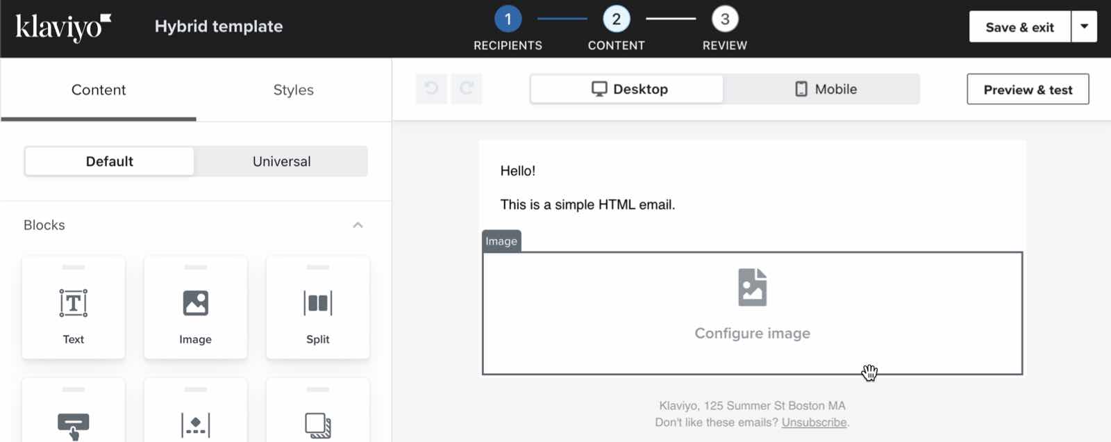 Leer hoe je aangepaste HTML-sjablonen kunt maken die compatibel zijn met Klaviyo's drag-and-drop editor (hybride sjablonen). Door deze stappen te volgen, kun je een volledig aangepaste HTML e-mail ontwerpen terwijl je toegang houdt tot functies die alleen beschikbaar zijn in de drag-and-drop editor (bijv. productblok of universeel inhoudsblok).