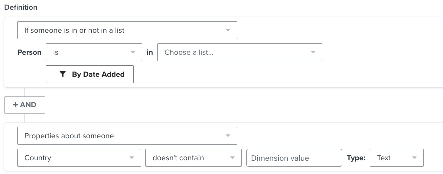 Als je meestal naar een segment verstuurt, kun je twee nieuwe voorwaarden toevoegen om alleen betrokken adressen uit dat land op te nemen: