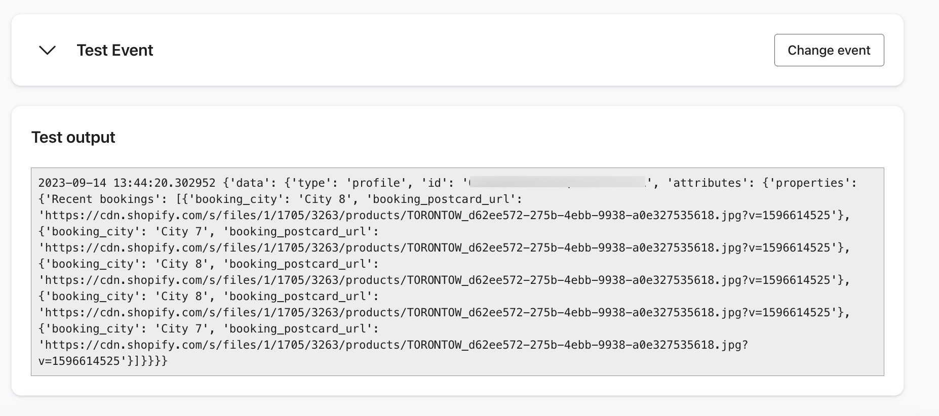- Nadat je een gebeurtenis hebt geselecteerd om mee te testen, wordt de testuitvoer getoond: