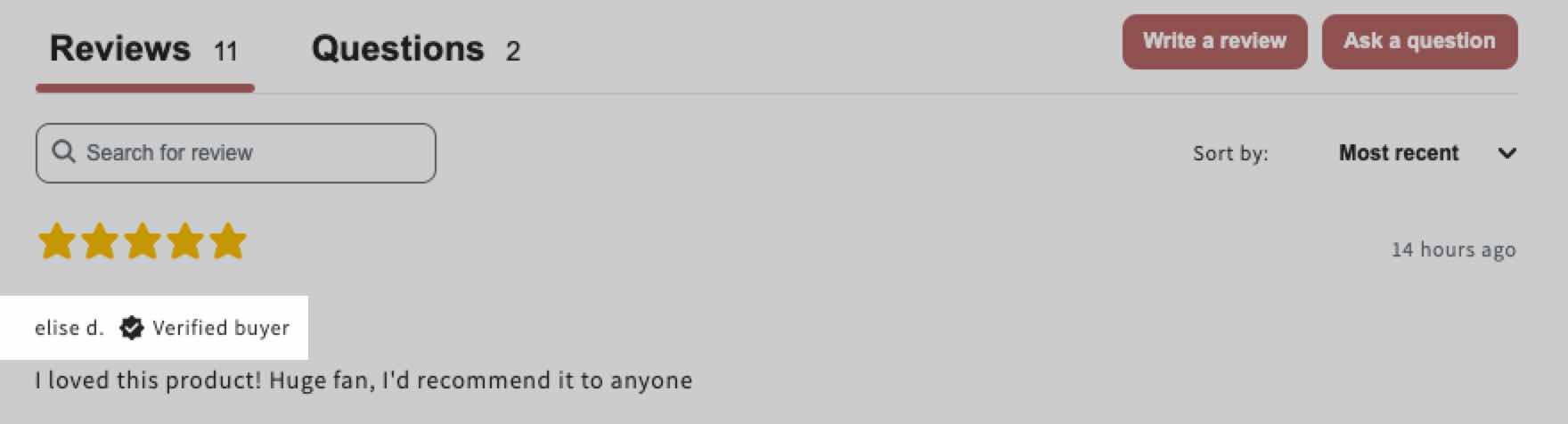 Als Klaviyo met zekerheid kan vaststellen dat een echte koper van het product een recensie indient, zal het de recensie als geverifieerd markeren. In de Klaviyo Alle beoordelingen lijst hebben geverifieerde beoordelingen een klein vinkje naast de weergavenaam van de beoordelaar.