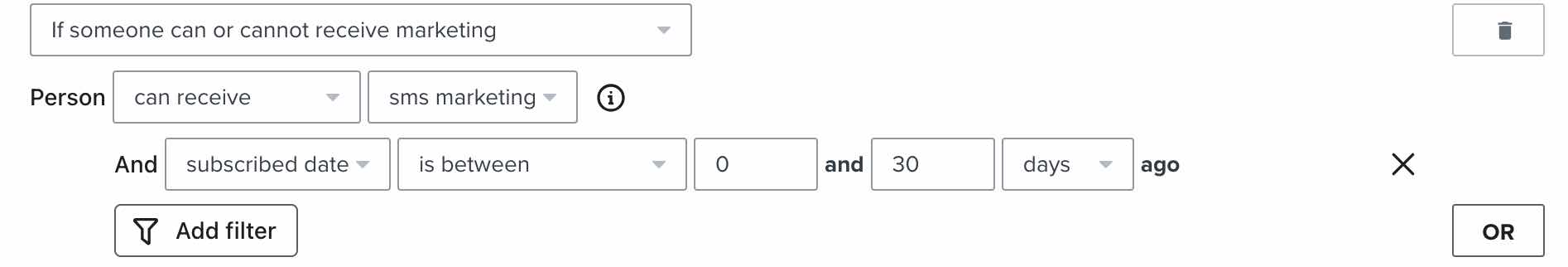 Klik op Filter toevoegen nadat je een voorwaarde voor push toestemming hebt toegevoegd om push abonnee te identificeren die zich binnen een bepaald datumbereik heeft aangemeld. Dit filter is alleen beschikbaar als je > Mobile Push marketing kunt ontvangen selecteert.