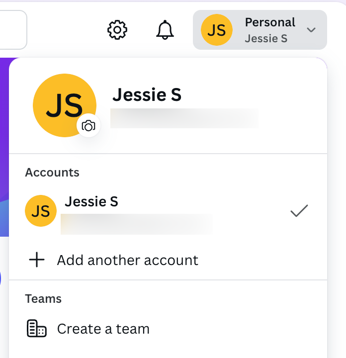 | Hoe de account vervolgkeuzelijst eruitziet in Canva | Wat dit betekent voor je integraties | |