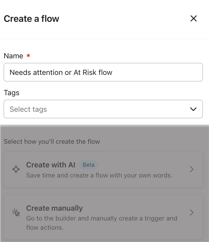 - In het zijpaneel Create flow geef je je flow een herkenbare naam en selecteer je een tag. Bijvoorbeeld iets als "At Risk of Needs Attention flow."