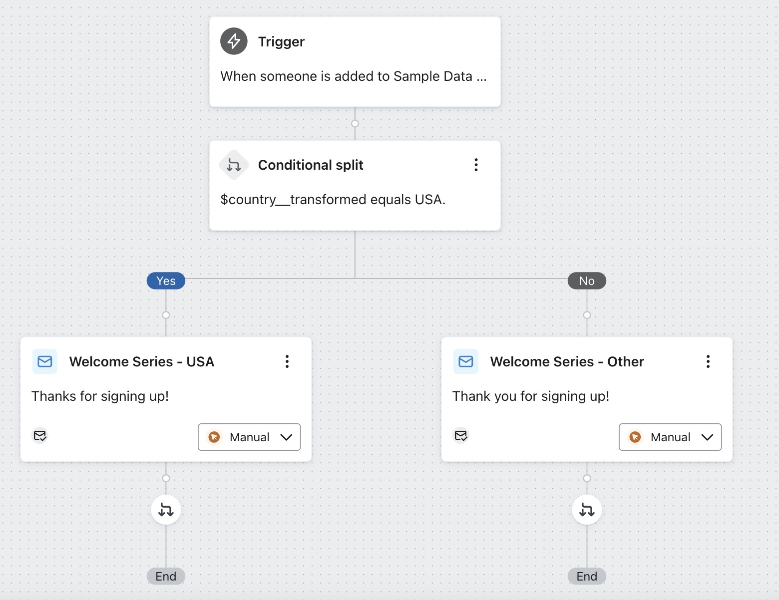 In het onderstaande voorbeeld stuurt een voorwaardelijke splitsing klanten die een welkomstflow invoeren via 2 verschillende paden, gebaseerd op het feit of ze zich in de Verenigde Staten bevinden. Hierdoor kun je de e-mail die abonnees ontvangen beter personaliseren op basis van locatie.