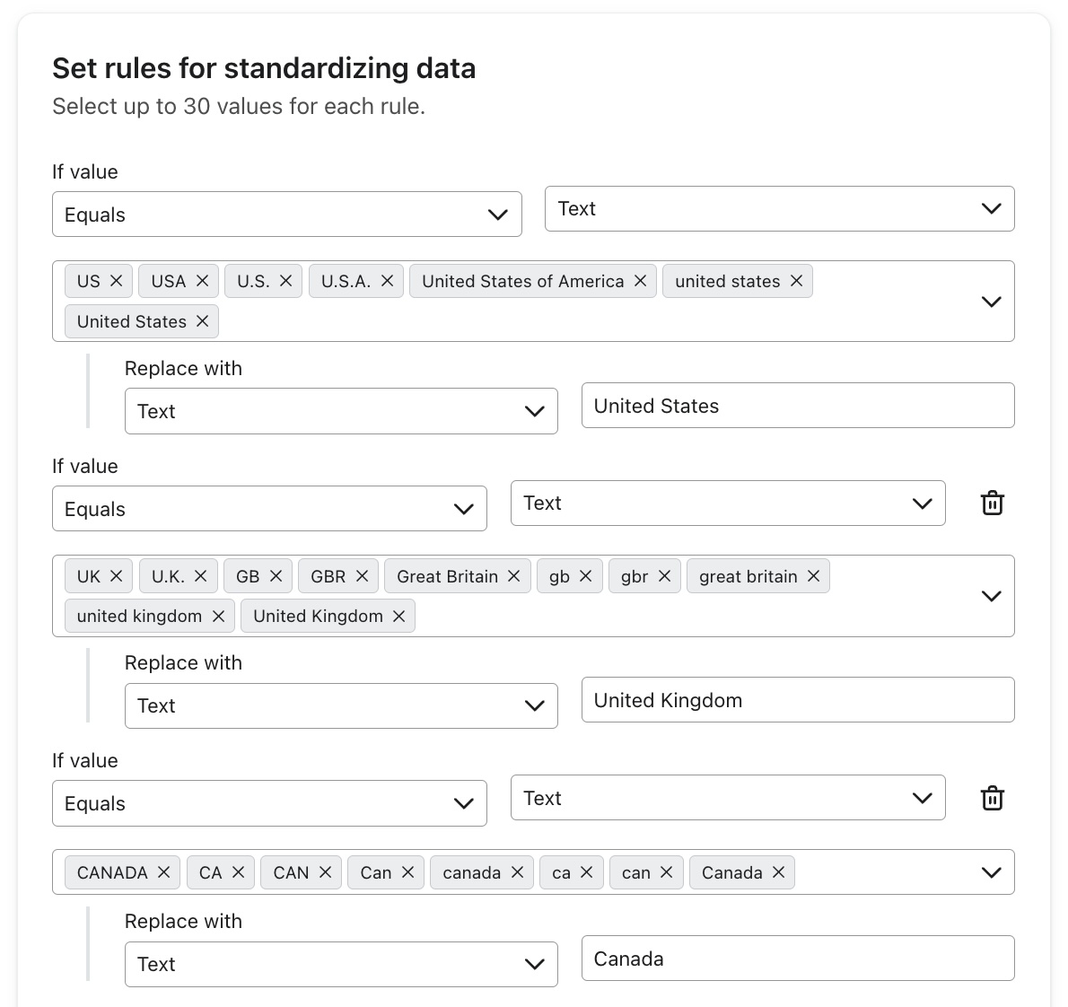 Een veelgebruikte toepassing voor deze transformatie is om de landnamen op je account te standaardiseren, zodat je er gemakkelijker mee kunt werken in segmentatie en flow.