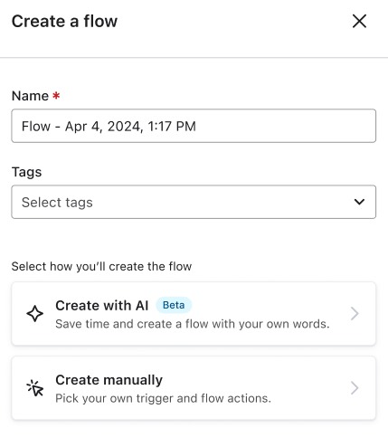 - Typ een beschrijving van de flow die je wilt maken. Als je niet precies weet hoe je de flow wilt structureren, typ dan het soort flow in dat je wilt maken (bijvoorbeeld winkelwagen verlaten flow) of begin met een eenvoudige structuur die je later kunt uitbreiden. Je kunt ook: