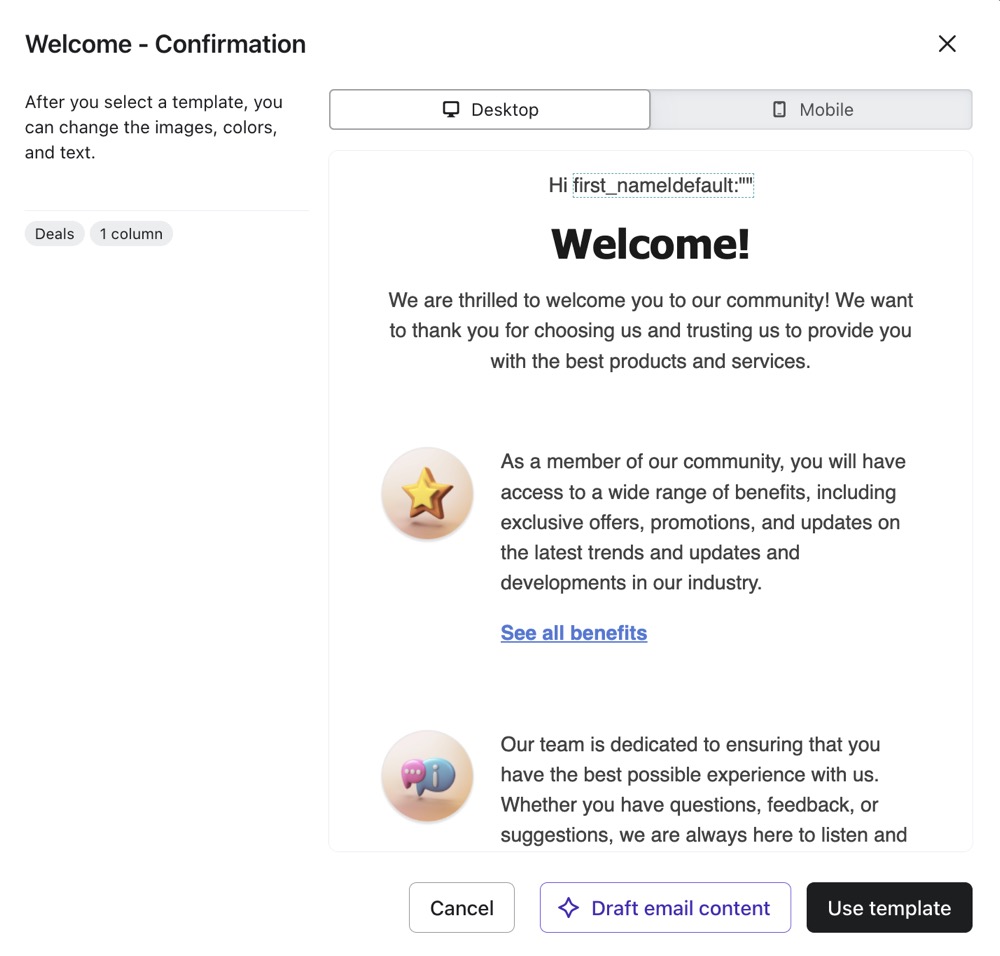 Voor de beste resultaten kies je een kant-en-klare template uit de bibliotheek of een die je al hebt gemaakt en die inhoud bevat (bijv. tekstblok, knoppen, splitsing, tabellen, etc.). Dit geeft AI voor e-mail een beter idee van de structuur en stijl die je zoekt. Sjablonen die voornamelijk uit afbeeldingen bestaan zijn moeilijker op te stellen met AI voor e-mail.