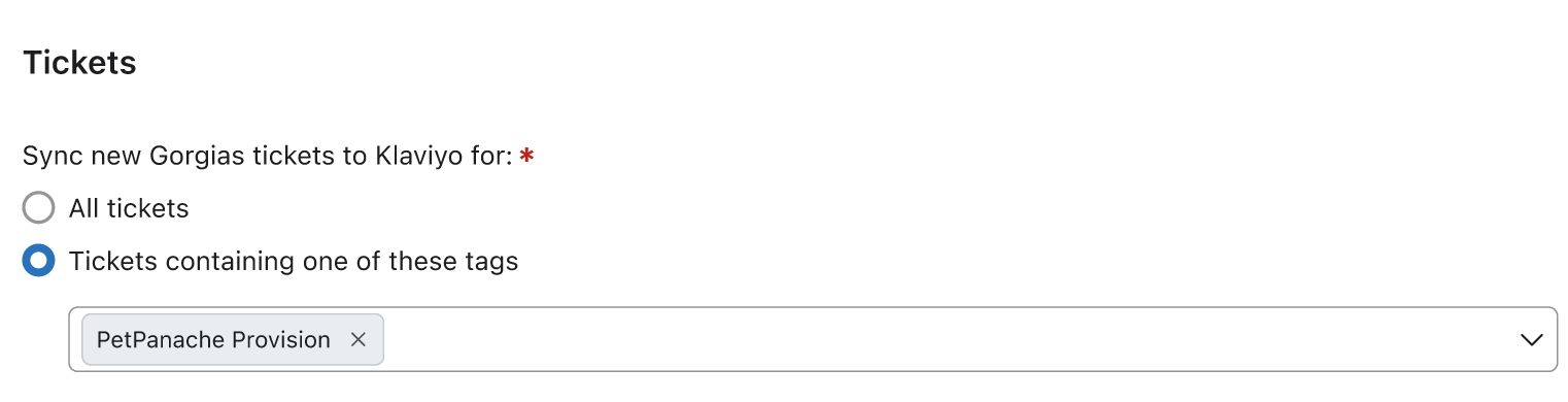 - We raden aan om één Gorgias merk per Klaviyo account aan te sluiten. Selecteer onder Tickets de tag die overeenkomt met het merk Gorgias dat je wilt gebruiken met dit Klaviyo account en synchroniseer nieuwe tickets naar Klaviyo.