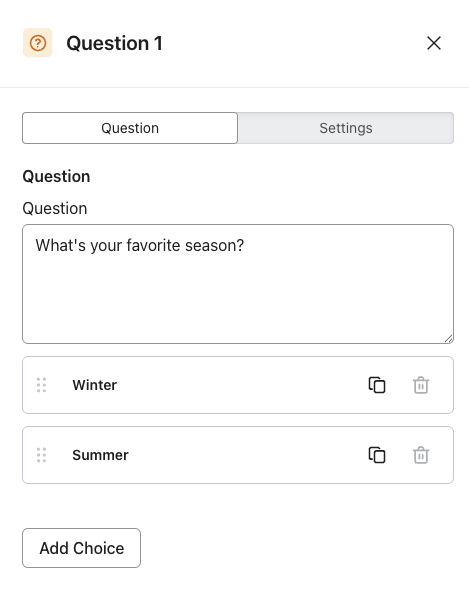 - Klik op Vraag toevoegen om een vraag met meerdere keuzes te stellen.