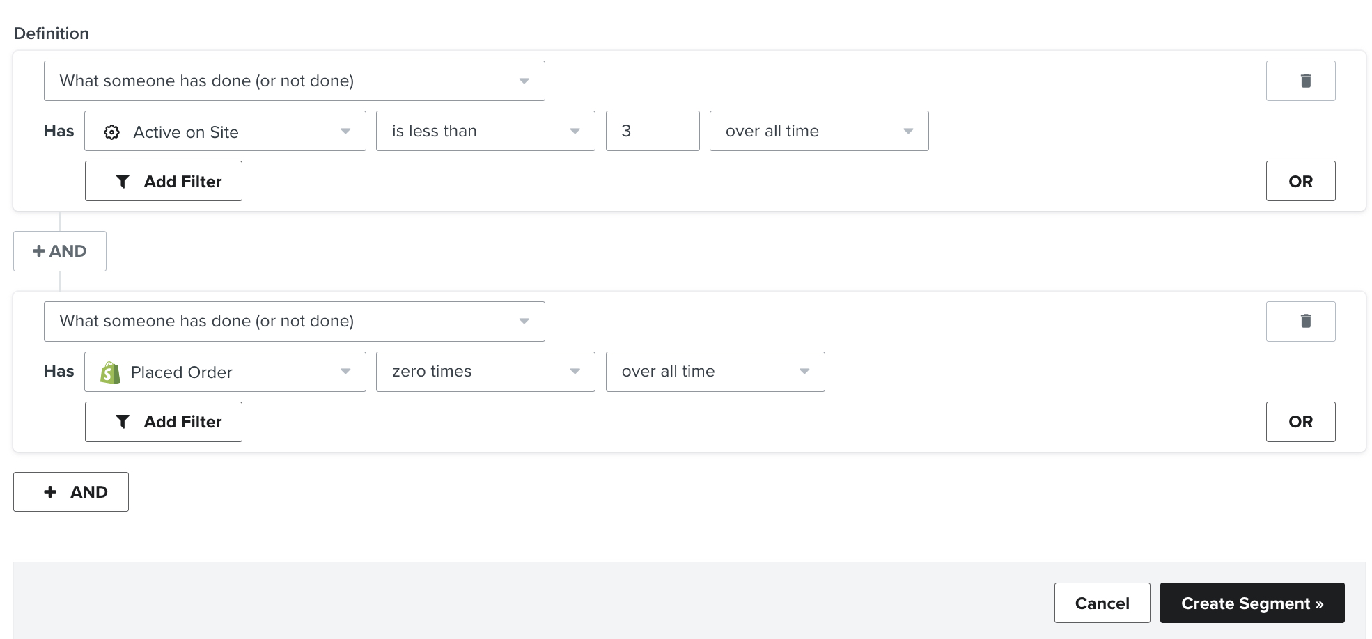 Voeg vervolgens een voorwaarde toe die aangeeft dat ze nog nooit eerder een bestelling hebben geplaatst. Zorg er bij deze voorwaarde voor dat je het tijdsbestek uitbreidt naar alle tijd.
