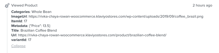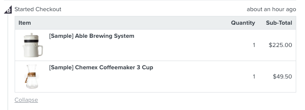 Wat de meetwaarde betekent: Begonnen afrekenen in BigCommerce betekent dat een klant zijn/haar contactpersoon en verzendgegevens invult op de pagina vóór de betaalpagina en op doorgaan klikt. De gebeurtenis Klaviyo tracks bevat alle productinformatie over de artikelen in iemands winkelwagen, inclusief productnamen, afbeeldingen en categorie-informatie, zodat je die informatie kunt gebruiken in je winkelwagen verlaten e-mail.