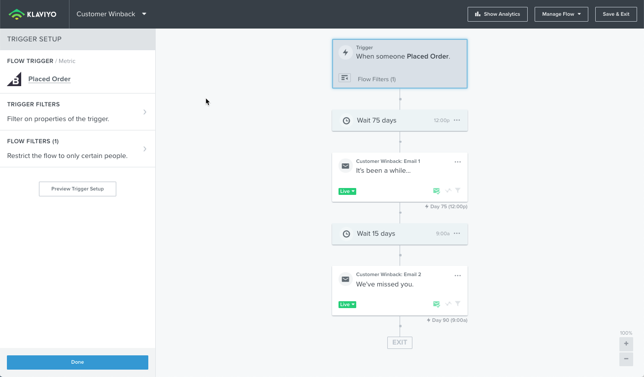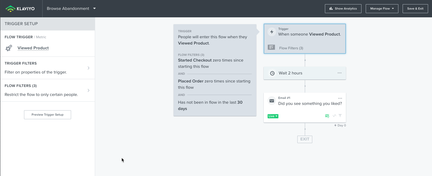 Klaviyo biedt een kant-en-klare flow voor websiteverlaters die verschijnt in je flow tab als je integreert met BigCommerce.