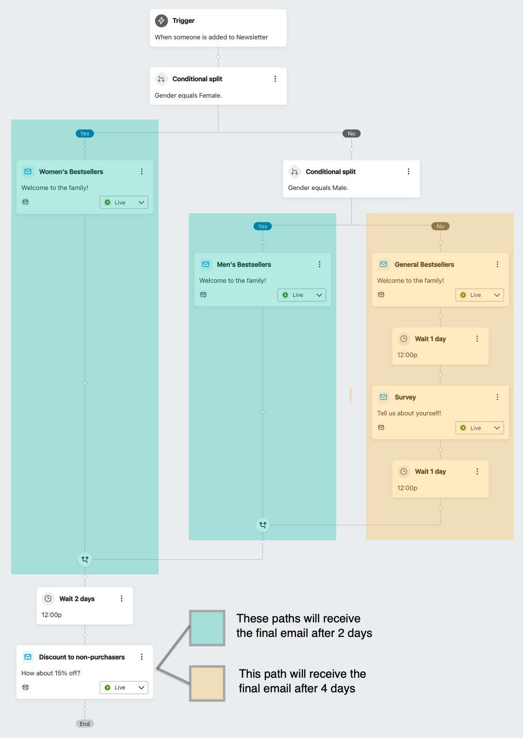 In het onderstaande voorbeeld zijn er drie paden die na de samenvoeging samenkomen. De twee in het groen gemarkeerde paden ontvangen de laatste kortingse-mail na de aanmelding na twee dagen, terwijl degenen die van het geel gemarkeerde pad komen dezelfde e-mail na vier dagen ontvangen vanwege de extra tijdsvertragingen die voor dit pad zijn ingesteld.