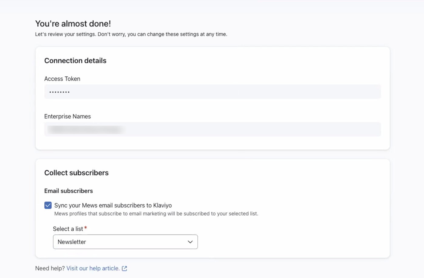 Vink op de volgende pagina het vakje Synchroniseer je Mews e-mail abonnee met Klaviyo aan als je dat wilt.