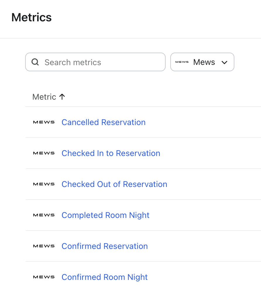 - Hier kun je alle meetwaarden in je ' account' bekijken. De meetwaarde met een Mews-icoontje laat alle meetwaarden zien die zijn gesynchroniseerd vanuit je Mews-integraties.