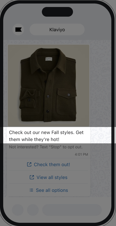 Om een idee te krijgen van hoe je WhatsApp template eruit zal zien wanneer deze door klanten wordt ontvangen, kun je de preview-functie van Klaviyogebruiken.