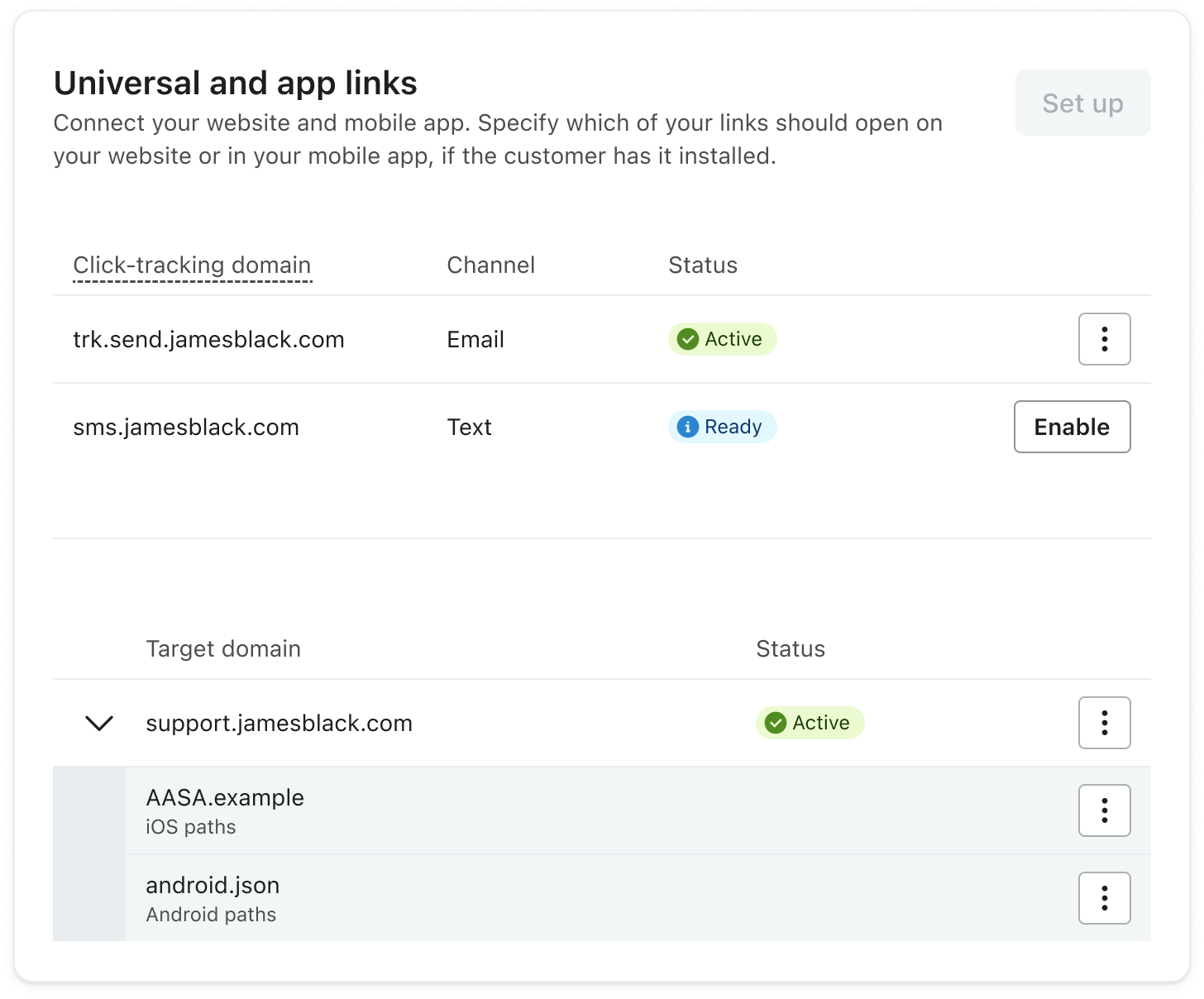Ga terug naar de instellingenpagina. Selecteer de click-tracking domein(en) die moeten worden geopend op je app en klik op Inschakelen