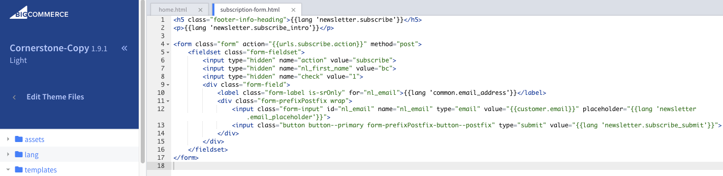 Jeśli pracujesz z domyślnym motywem, opcja edycji plików motywu nie pojawi się. Najpierw utwórz kopię motywu, a następnie wprowadź zmiany w kopii. Jest to najbardziej prawdopodobne, jeśli jesteś nowym użytkownikiem BigCommerce lub jeśli nigdy wcześniej nie edytowałeś domyślnego motywu. - Przejdź doszablonów > components > common > subscription-form.html. Kliknięcie subscription-form-html otwiera plik w edytorze stron internetowych.