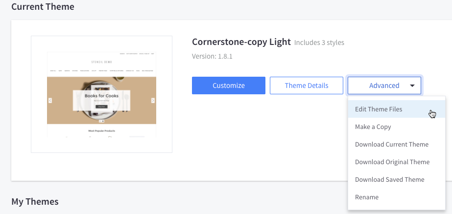 - W polu Bieżący motyw kliknij menu rozwijane Ustawienia zaawansowane i kliknij Edytuj pliki motywu. Spowoduje to otwarcie edytora stron internetowych.