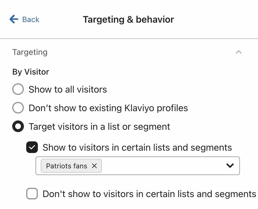 Następnie skieruj do tego segmentu formularz informujący klientów o nowych ofertach na odzież damską marki Patriots. Zamiast organizować obszar na potrzeby subskrybowania wiadomości marketingowych, łącze do tej strony umieść na swojej witrynie. Podobnie: skonfiguruj formularz tak, aby był kierowany tylko do osób w wybranym segmencie.