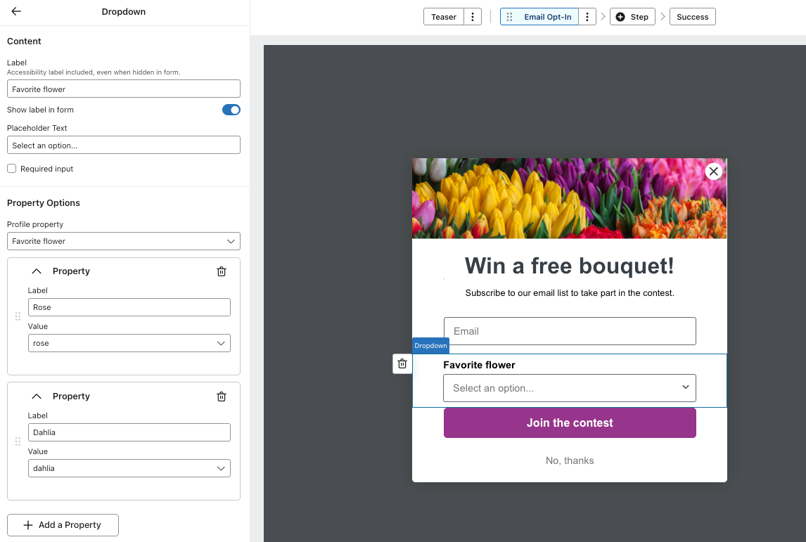 W powyższym przykładzie klient może wybrać ulubiony kwiat za pomocą listy rozwijanej. Jeśli wybierze opcję „Dahlia” (Dalia), zostanie ona przypisana do jego profilu na Twoim koncie. Jeżeli w profilu tej osoby istnieje już wartość dla tej właściwości, po przesłaniu formularza istniejąca wartość zostanie zastąpiona nową wartością.
