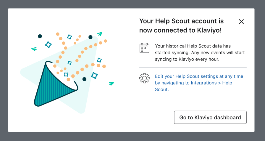 Dowiedz się, jak zintegrować Help Scout z Klaviyo, aby zsynchronizować importowanie metryki o konwersacjach Help Scout z kontem Klaviyo, co może pomóc w ukierunkowanym wysyłaniu wiadomości. KlaviyoWbudowana integracja Help Scout w pełni pomaga Help Scout's Mailbox API 2.0. Integracje Help Scout synchronizują się z Klaviyo co godzinę.