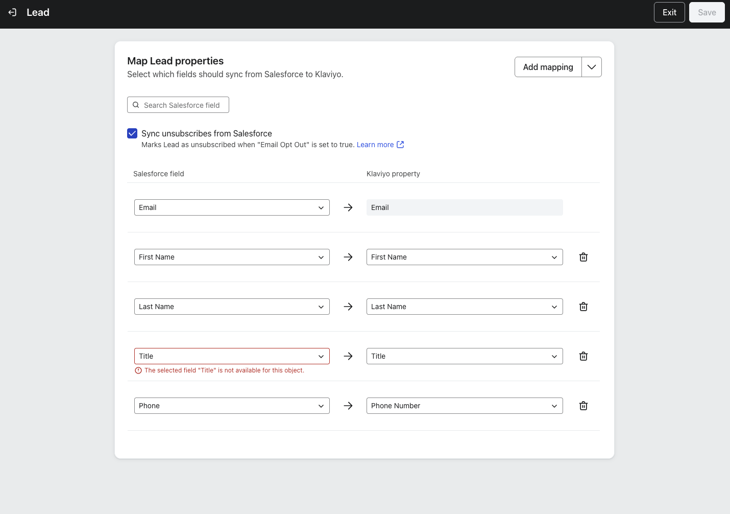 Jeśli zmapowane pole Salesforce nie jest już dostępne i nie jest wymagane, Klaviyo to zrobi:
