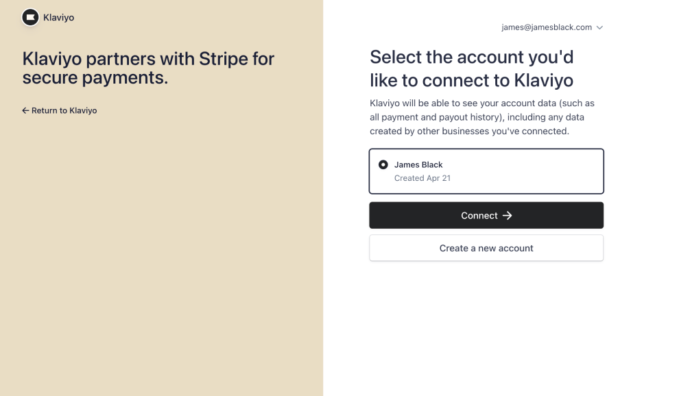 - Wybierz konto Stripe, które chcesz połączyć z Klaviyo i kliknij Połącz.