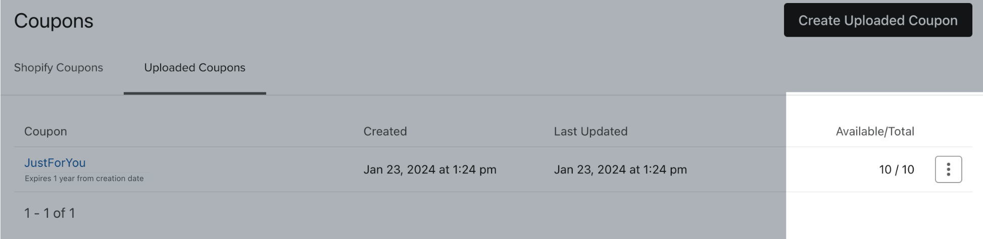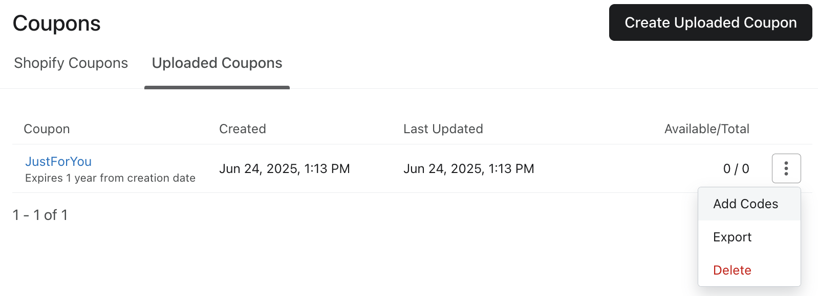 - W zakładce Przesłane kupony wybierz 3 kropki > Dodaj kody obok swojego kuponu.