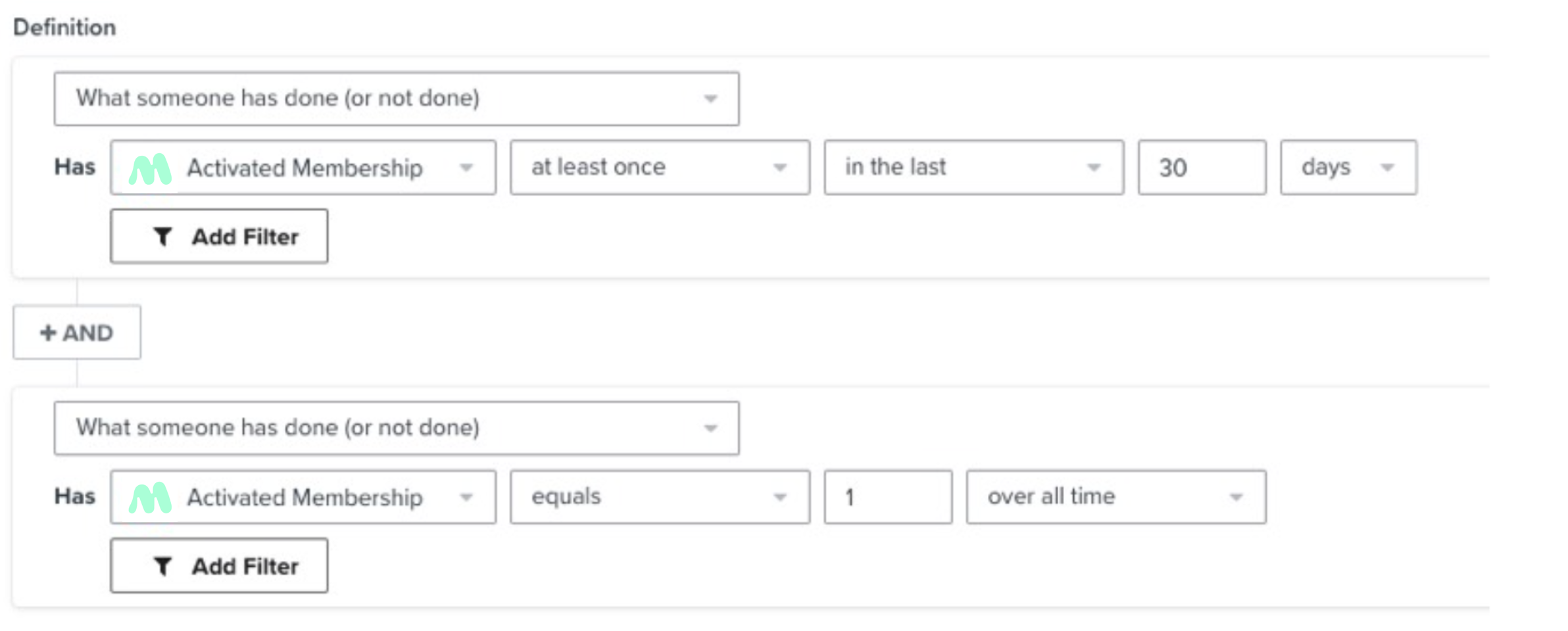 - W sekcji Definicja wybierz opcję Co ktoś zrobił (lub czego nie zrobił) > Aktywowane członkostwo > co najmniej raz > w ciągu ostatnich > 30 > dni.