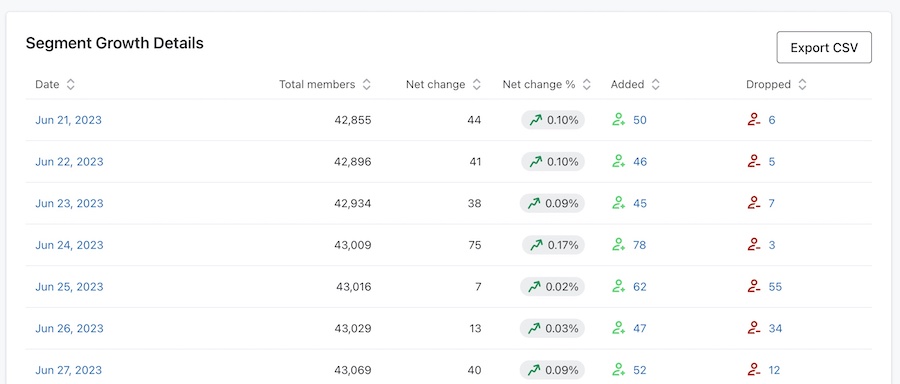 Na głównej karcie szczegółów wzrostu segmentu masz możliwość wyeksportowania całej tabeli zagregowanych sum danych jako pliku CSV. Eksport będzie zawierał praktycznie wszystkie te same informacje, które są wyświetlane w tabeli, ale bez żadnych kolorowych wizualizacji.