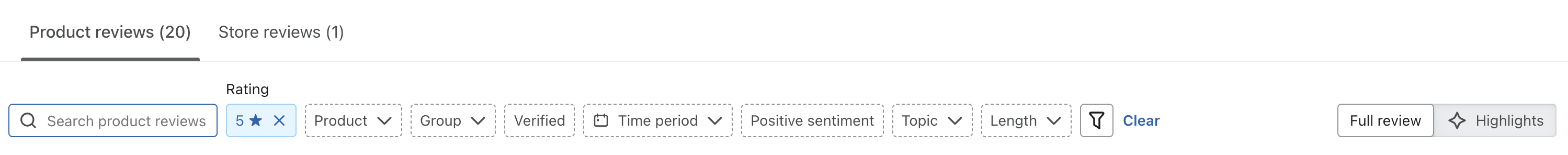 - Możesz przełączać między recenzjami produktów i recenzjami sklepów, filtrować według różnych kryteriów (np. oceny, produktu, statusu weryfikacji i innych) lub wybierać między pełnymi recenzjami i sztuczną inteligencją wybranych najważniejszych elementów za pomocą menu filtrowania.
