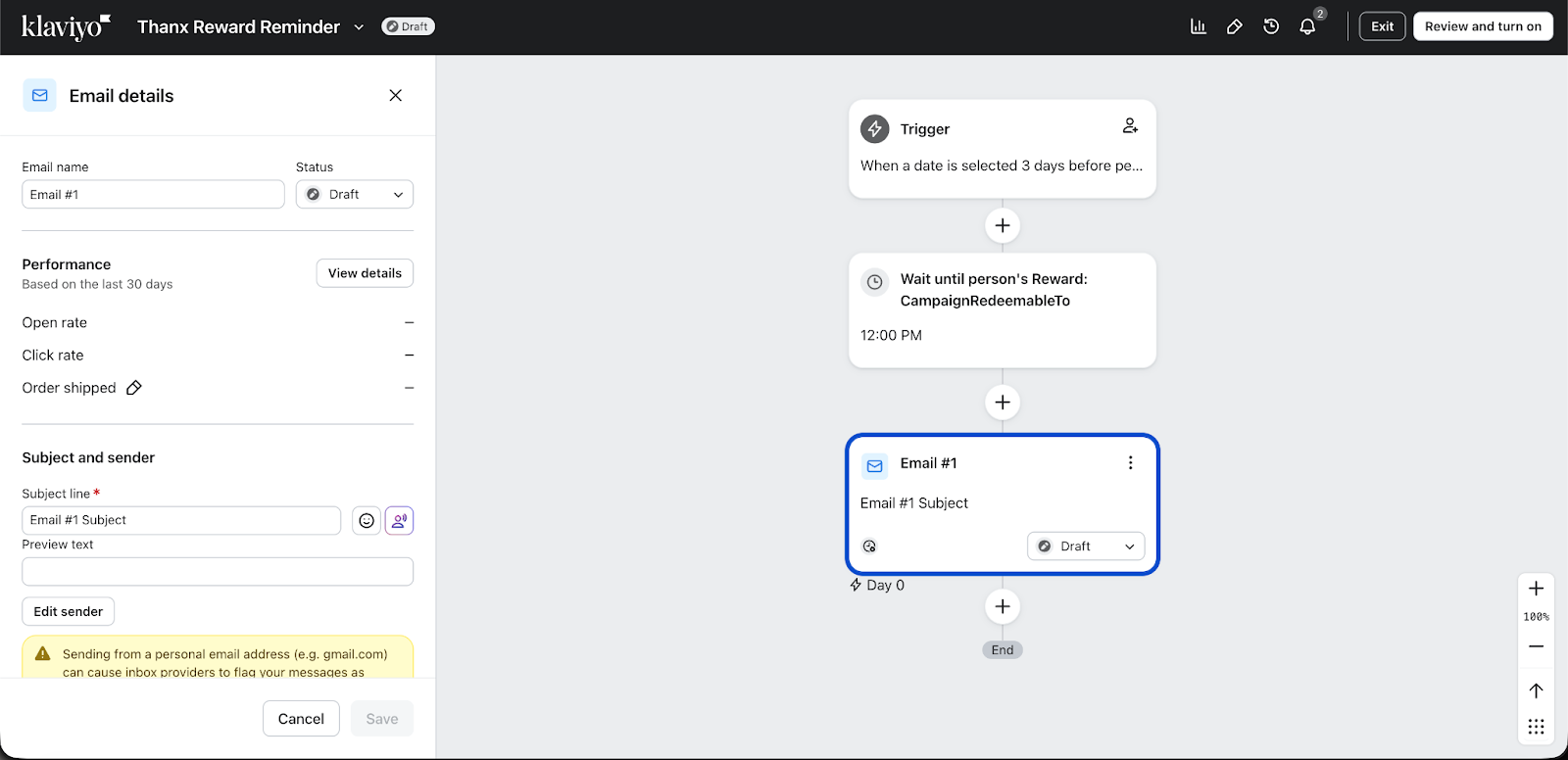 Aby uruchamiać sekwencje, możesz również użyć obiektu nagrody w postaci podziękowania. Możesz na przykład wysłać wiadomość do odbiorcy 3 dni przed zaplanowanym wygaśnięciem nagrody.