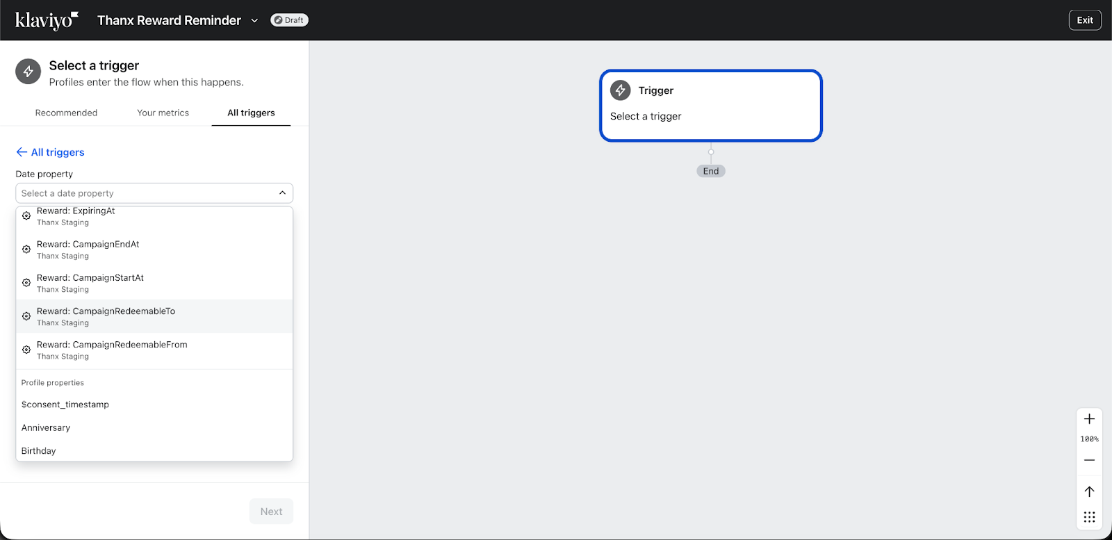 - Z listy rozwijanej wybierz Reward: CampaignRedeemableTo z integracji Thanx.
