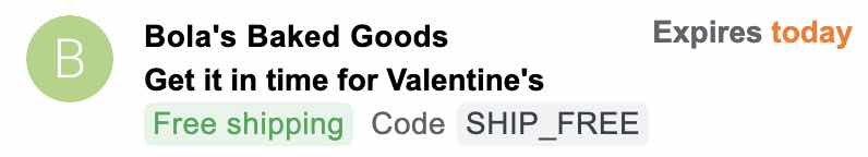 Wyróżnij promocję lub ofertę, taką jak kod kuponu lub bezpłatna wysyłka, wraz z datą wygaśnięcia. -