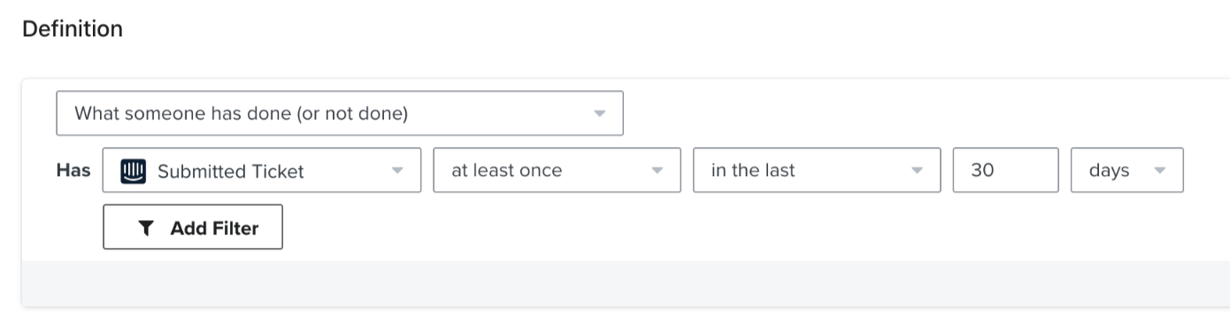 - W sekcji Definicja wybierz opcję Co ktoś zrobił (lub czego nie zrobił) > Przesłany bilet > co najmniej raz > w ciągu ostatnich > 30 > dni.