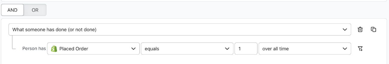 Gdy to zrobisz, pierwsze 2 kroki twojego segment powinny wyglądać jak poniżej i obejmować wszystkich, którzy znajdują się w twoich grupach wymagających uwagi lub zagrożonych. - Opcjonalnie: Grupy zagrożone i wymagające uwagi mogą obejmować osoby, które dokonały co najmniej jednego zakupu w przeszłości. Jeśli jednak chcesz dotrzeć do klientów, którzy dokonali zakupu określoną liczbę razy w przeszłości (np. tylko jednorazowi nabywcy), ale obecnie znajdują się w grupach Zagrożeni lub Wymagający uwagi, możesz użyć warunku +Dodaj , aby dodać łącznik AND.