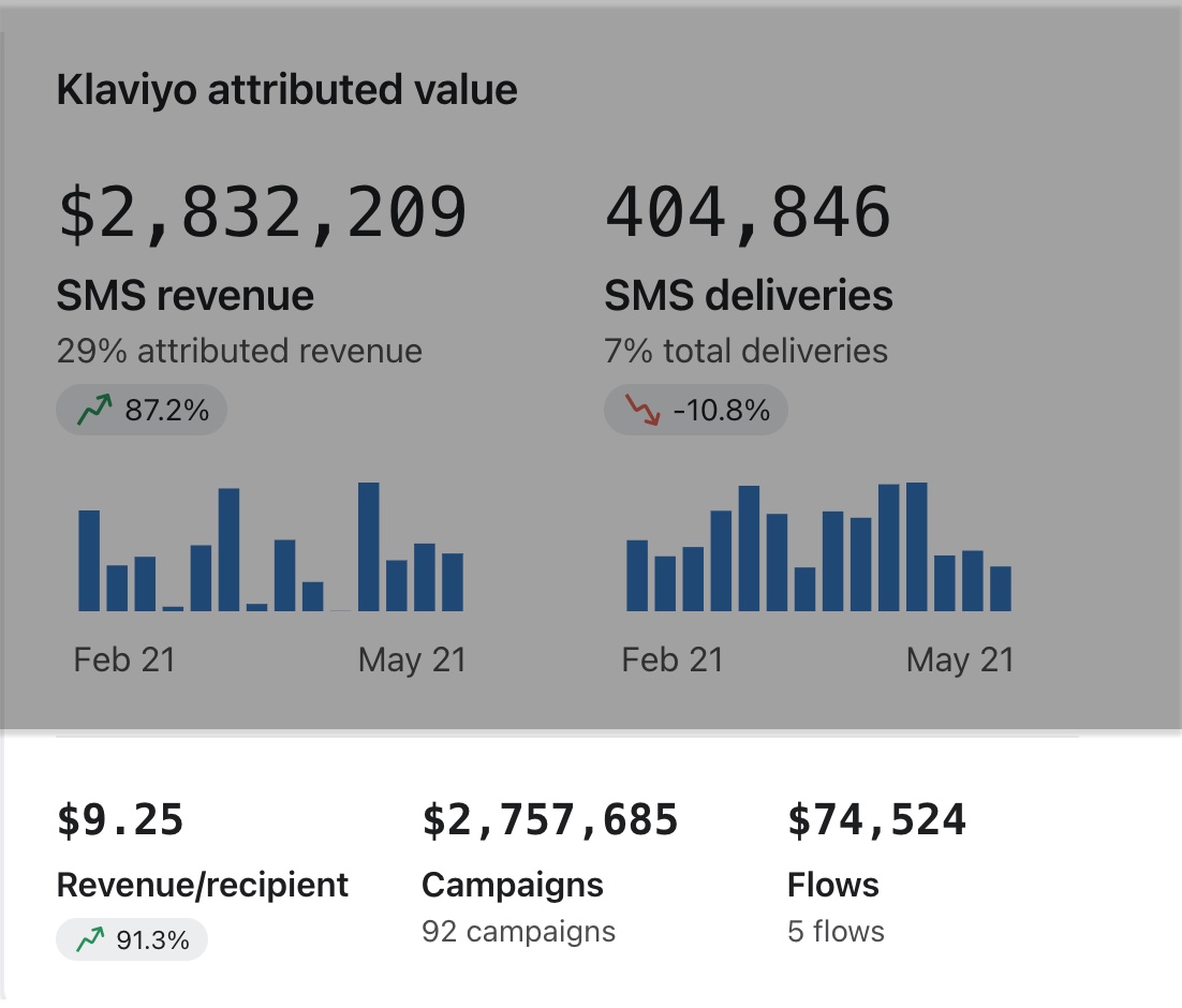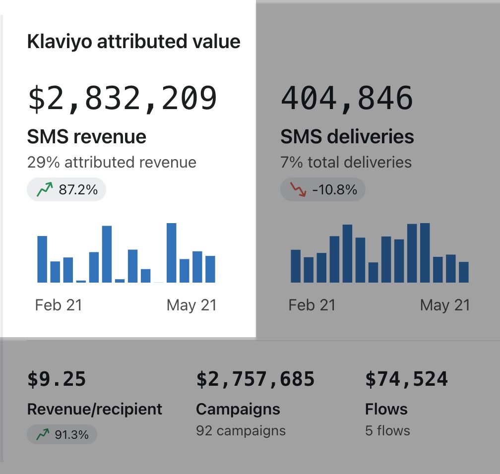Górna duża liczba to całkowita wartość przypisana Klaviyo (KAV) (przychody / przychód lub całkowita liczba, w zależności od wybranej konwersji metryki). Procent poniżej tej wartości reprezentuje SMS-y ze wszystkich połączonych kanałów (29% w poniższym przykładzie). Innymi słowy, jeśli korzystasz z poczty e-mail, Push i SMS razem, odsetek ten stanowi przypisany przychód lub konwersję dla samego SMS.