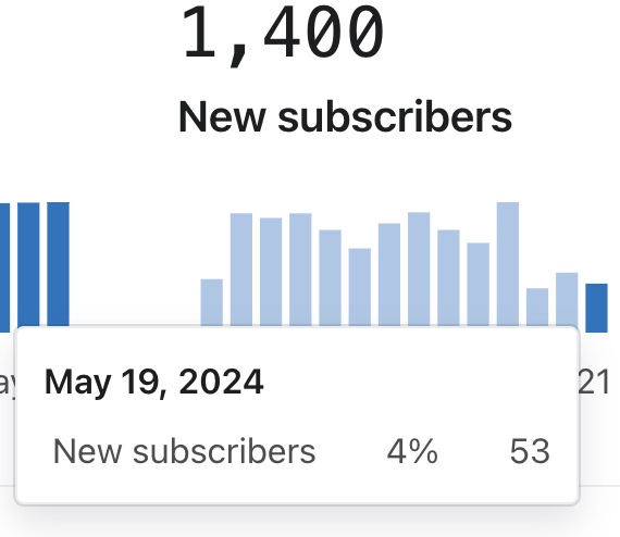 Liczba w prawym górnym rogu przedstawia całkowitą liczbę nowych subskrybentów SMS pozyskanych w wybranym przez Ciebie okresie. Dodatkowo, najeżdżając kursorem na dowolny słupek na wykresie, możesz sprawdzić liczbę nowych subskrybentów dodanych w danym momencie (pokazaną zarówno jako procent, jak i suma całkowitej liczby nowych subskrybentów).