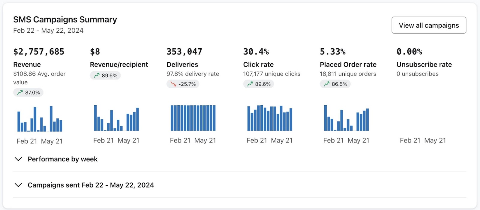 W zależności od tego, jaką konwersję metryki wybierzesz, karta podsumowaniaSMS kamp anie odzwierciedla dodatkowe wskaźniki wydajności dla pojedynczej SMS kampanie, podczas gdy karta podsumowania sekwencja SMS -owa odzwierciedla wydajność sekwencji zawierającej SMS. Możesz również przejść do sekcji kampanie lub sekwencja, jeśli chcesz zagłębić się w więcej szczegółów związanych z Twoją SMS strategia marketingowa.