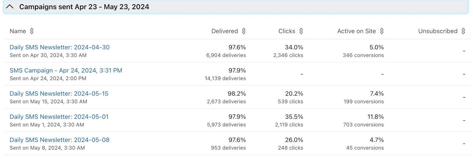 Kampanie wysłane lub sekwencja w tabelach odzwierciedlają okres czasu, który wybrałeś dla swojej ambony. Tutaj możesz sprawdzić dostarczenie, kliknięcia, konwersję metryki i wycofać subskrypcję na SMS kampania lub sekwencja, wraz z całkowitymi liczbami i procentami, które reprezentują.