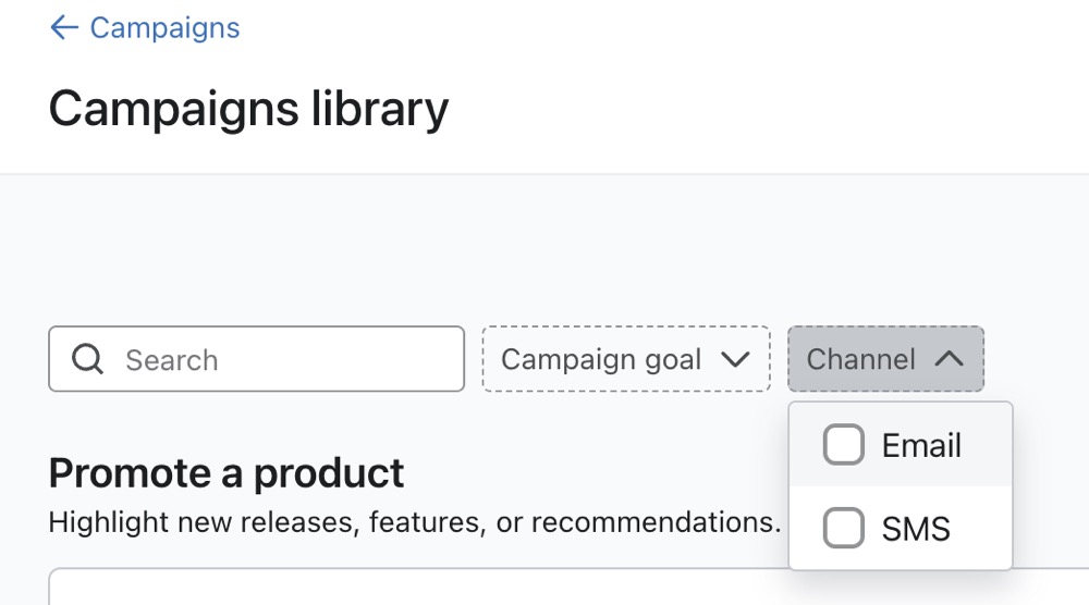 - Użyj rozwijanej listy kanałów , aby filtrować pomiędzy wysyłka e-mail i SMS kampanie.