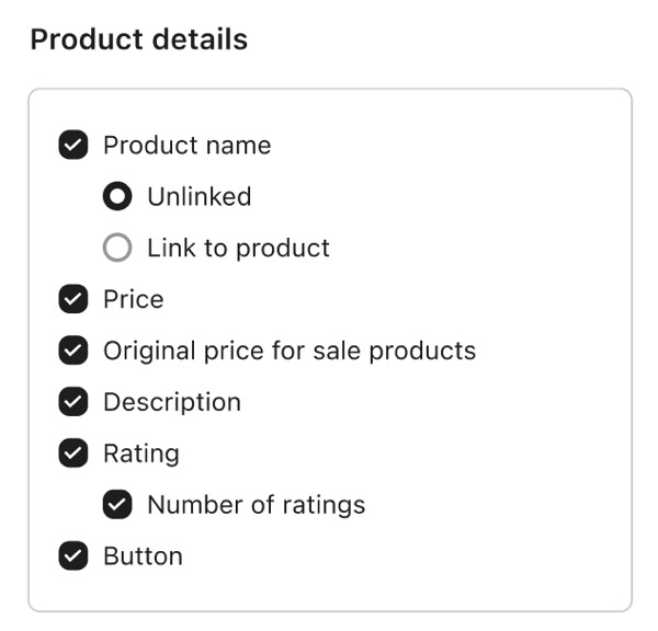 - W sekcji Szczegóły produktu na pasku bocznym zaznacz pole Ocena, aby wyświetlić ocenę w gwiazdkach dla każdego produktu w bloku.