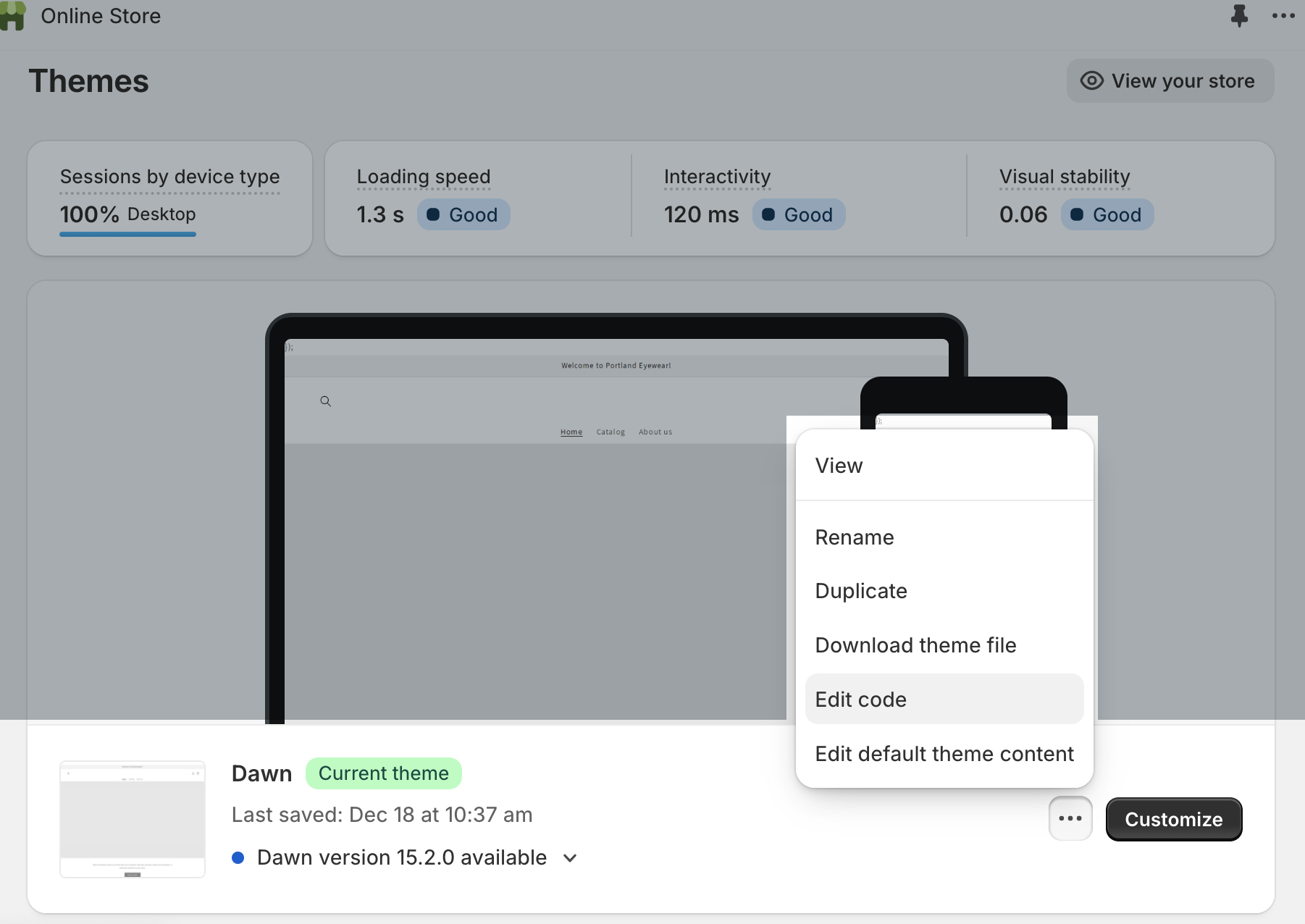 - Kliknij menu z trzema kropkami w bieżącym motywie, a następnie wybierz opcję Edytuj kod. Jeśli wolisz przetestować go na wersji roboczej motywu, najpierw zduplikuj bieżący motyw, a następnie edytuj kod zduplikowanego motywu.
