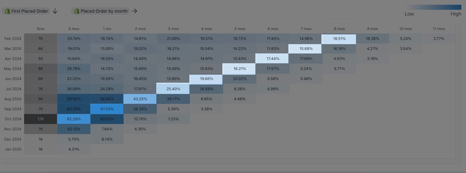 W przykładowym raporcie kohorty możesz zobaczyć, że w miarę schodzenia w dół kolumny konwersja generalnie wzrasta. Patrząc na kolumnę 1 mos (tj. 1 miesiąc), możesz zobaczyć, że liczba konwersji wzrasta dla nowszych kohort. Może to wskazywać, że pod koniec 2024 r. mogło mieć miejsce wydarzenie (np. wprowadzenie nowego produktu lub kampania marketingowa), które spowodowało ten wzrost. W szczególności kohorta z sierpnia 2024 r. odnotowała znaczny wzrost liczby profili, które dokonały dodatkowego zakupu w miesiącu po pierwszym zakupie (tj. 56,9% początkowej kohorty w porównaniu do 24,29% dla kohorty z lipca 2024 r. w tym samym względnym punkcie ich cyklu życia).