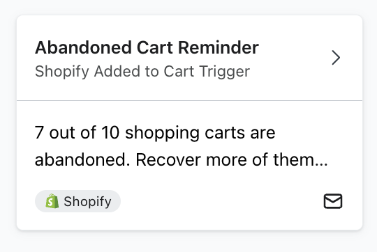 Dowiedz się, jak utworzyć sekwencję porzucony koszyk zakupowy wyzwalaną przez zdarzenie Shopify Added to Cart. Domyślna sekwencja Klaviyo porzucony koszyk zakupowy jest uruchamiana przez zdarzenie Shopify strona płatności kasa Started, podczas gdy sekwencja Added to Cart porzucony koszyk zakupowy jest skierowana do bardziej przypadkowych kupujących, którzy jeszcze nie uruchomili strony płatności kasa.
