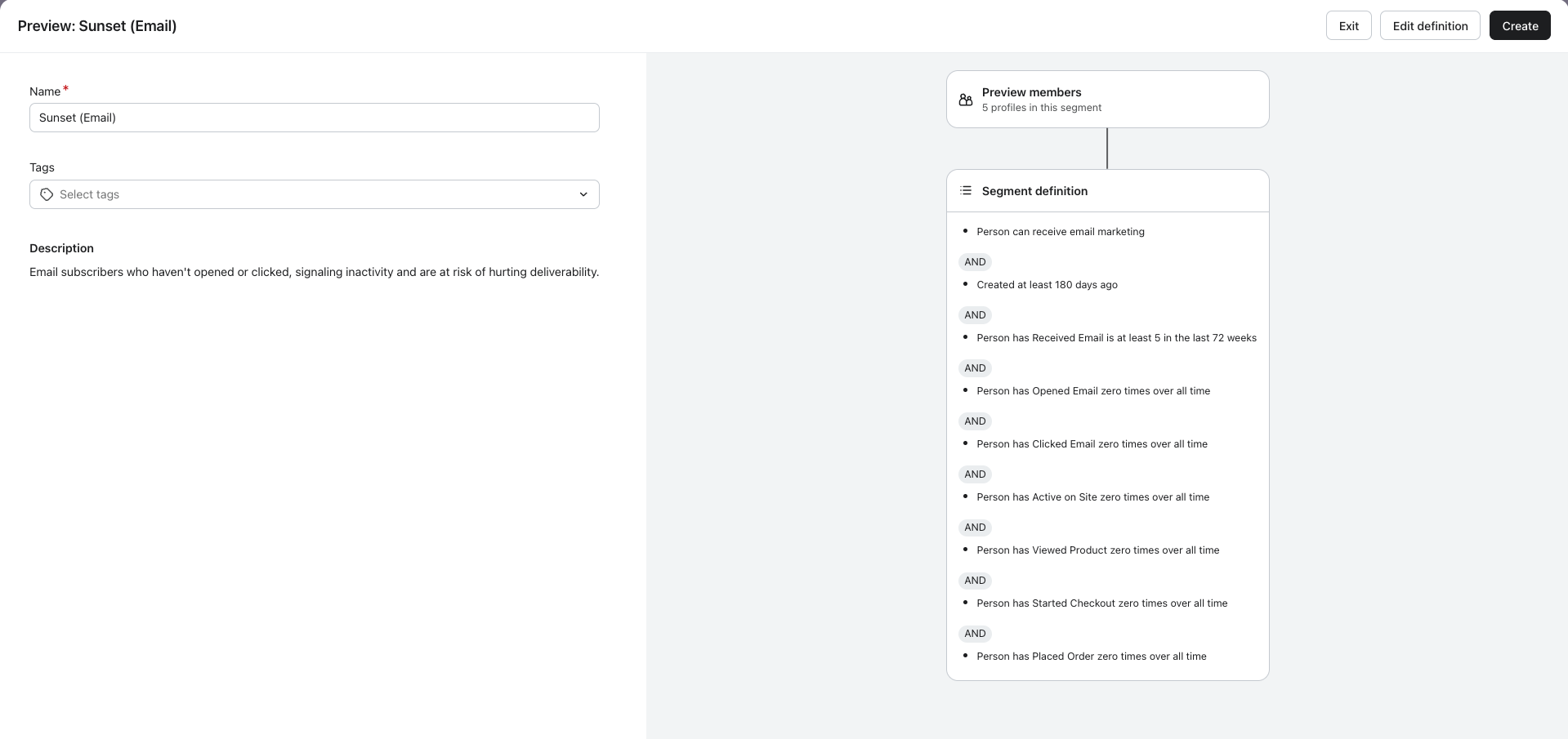 Ta definicja pojawia się również jako wstępnie zbudowany segment Sunset (Email) w bibliotece segmentów i jest to ta sama logika, której Klaviyo używa do ograniczania rekomendacji na stronie ograniczonego profilu.